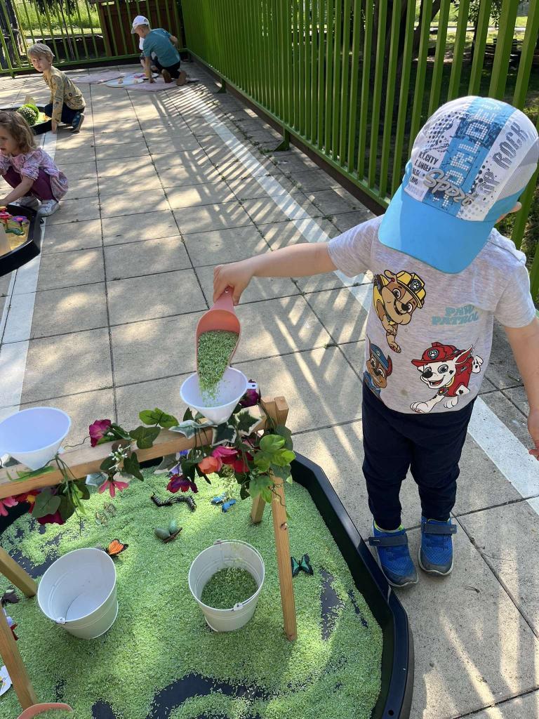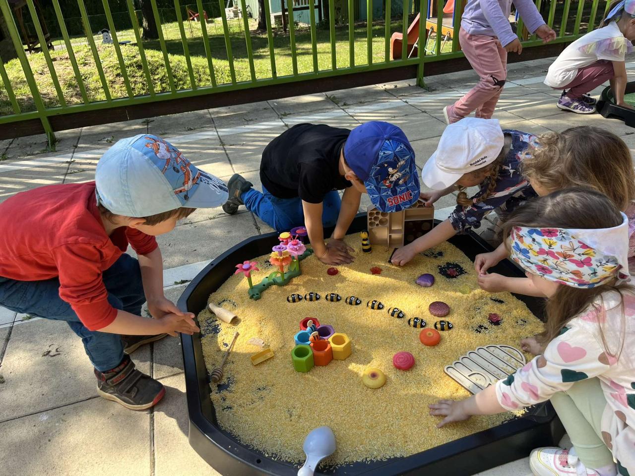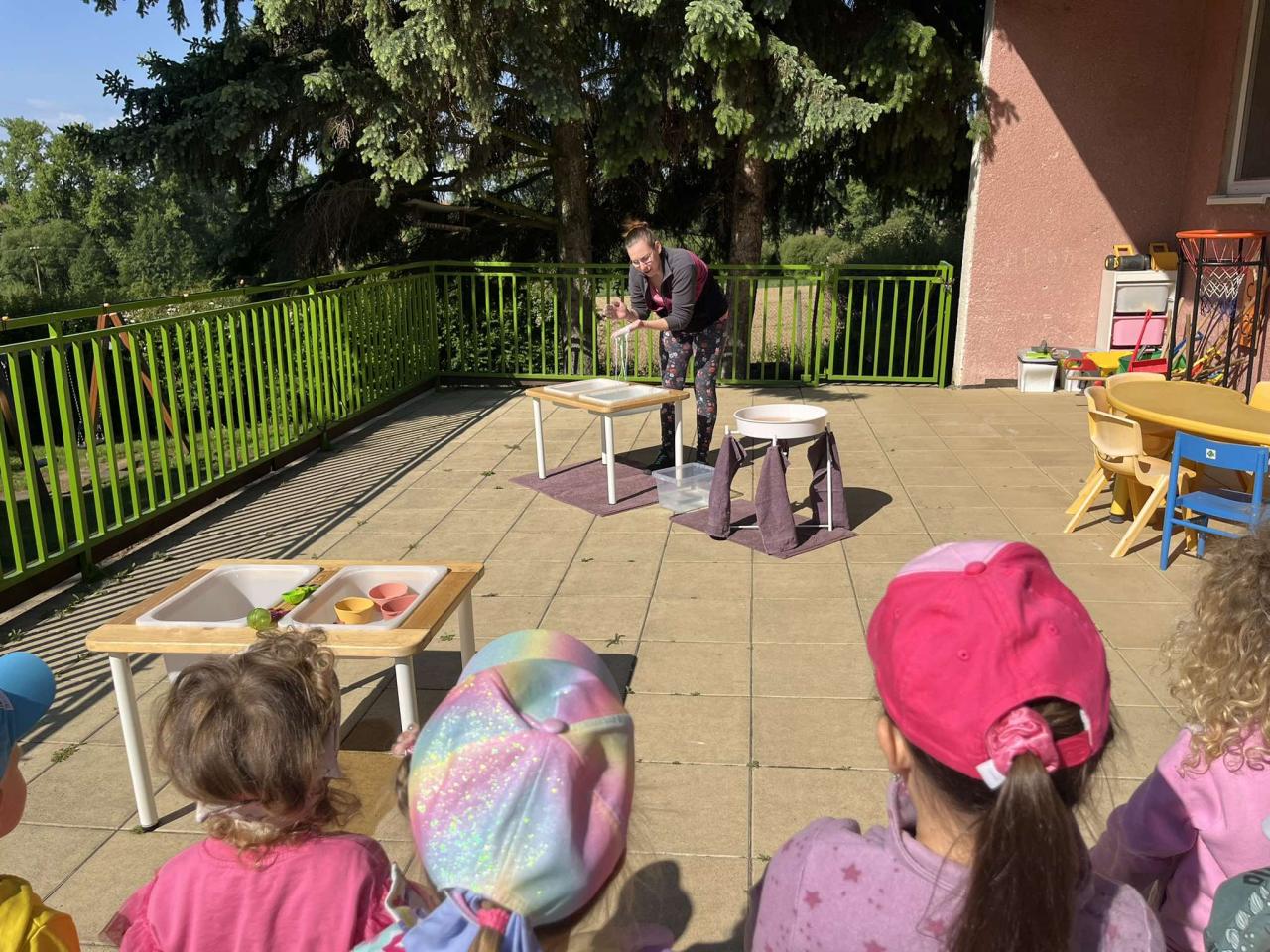Po roce za námi přijela Kačka se svým hmyzím smyslohraním a protože bylo krásně, tak nám ho připravila na terase naší mateřské školy, bylo to príma. Seznámili jsme se s vývojem mravence, šneka, motýla, pavouka, žáby + přesypávali jsme rýži, kávu, hráli si se slizem, cizrnou a modelínou.