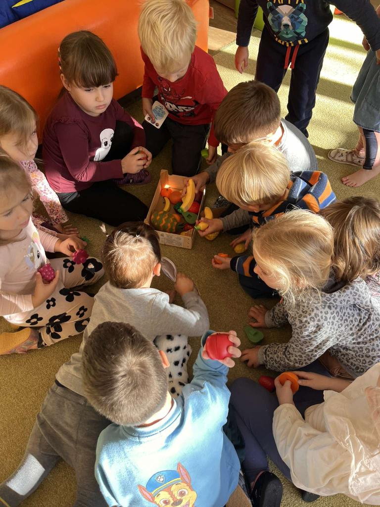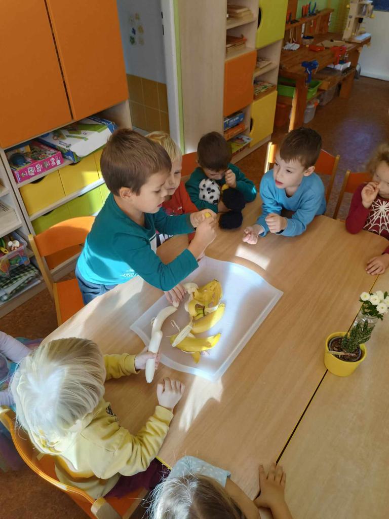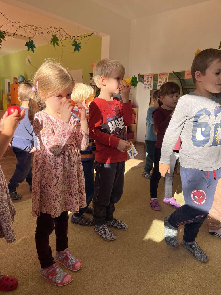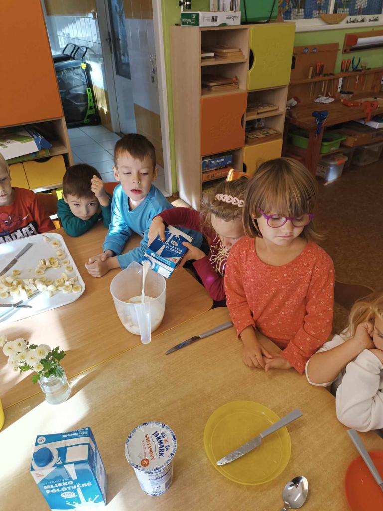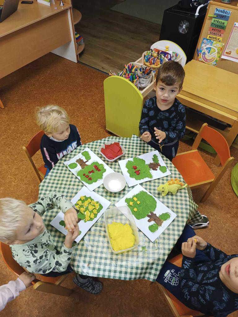 Ovoce bylo tématem tohoto týdne. Ovoce jsme poznávali smysly, vytvářeli jsme ovocné stromy, zapouštěli vodové barvy do klovatiny, hráli jsme různé pohybové hry a v pátek si umixovali ovocný koktejl.